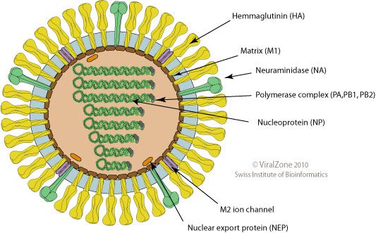 When the gene sequences of these human viral isolates are compared with closely related avian strains, numerous differences are revealed. The locations of the proteins in the influenza virion are shown on the diagram; click for a larger version (figure credit: ViralZone).