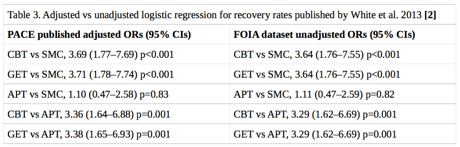 If QMUL or the PACE trial investigators believe that further adjustment is necessary here to have confidence in the results, then we invite them to present analyses that include stratification variables or release the raw data for those variables without unnecessary restrictions.