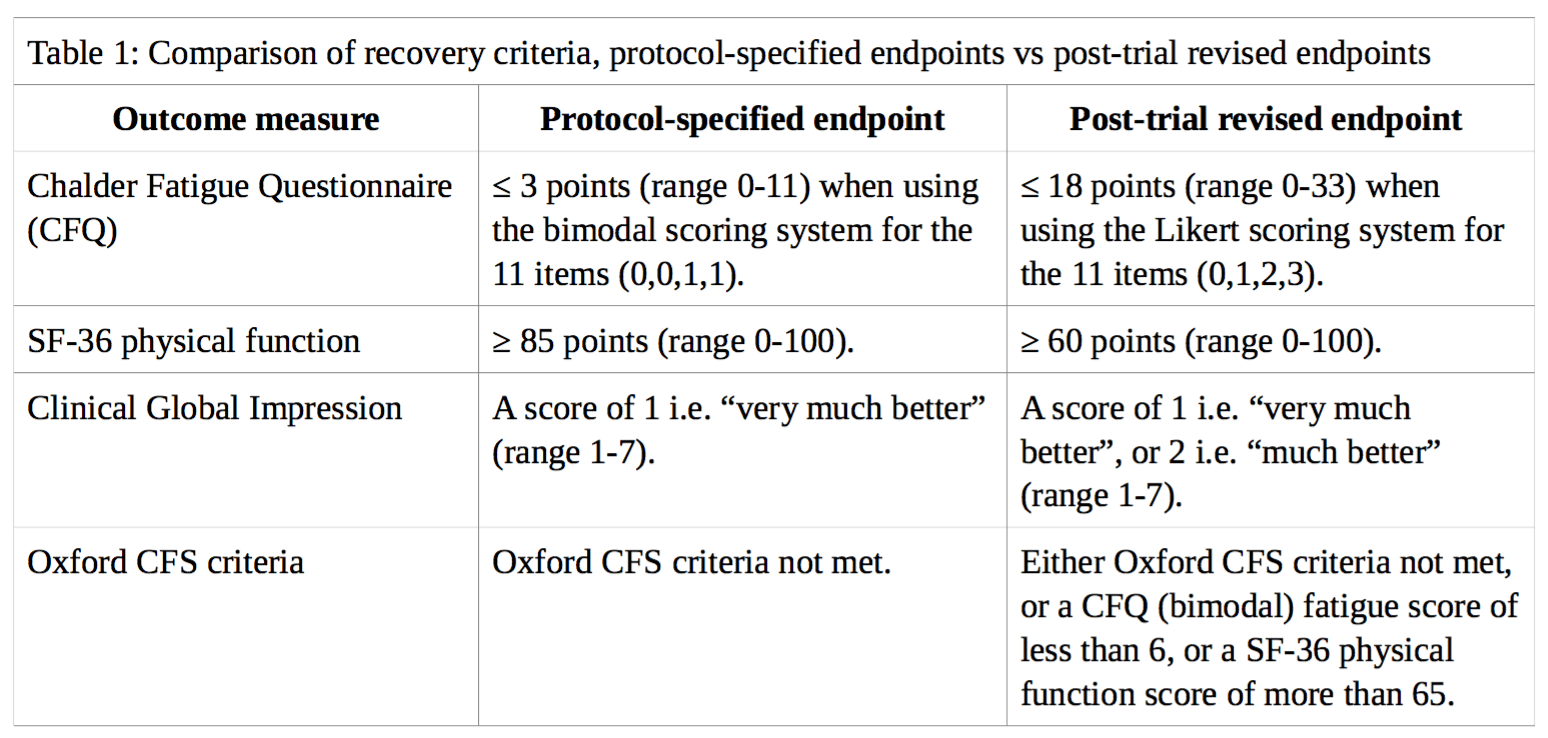 After making major changes to the protocol-specified recovery criteria, White et al. (2013) reported that when using a comprehensive and conservative definition of recovery, CBT and GET were associated with significantly increased recovery rates of 22% at 52-week follow-up, compared to only 8% for APT and 7% for SMC [2]. However, those figures were not derived using the published trial protocol (White et al., 2007 [3]), but instead using a substantially revised version that has been widely criticised for being overly lax and poorly justified (e.g. [4]). For example, the changes created an overlap between trial eligibility criteria for severe disabling fatigue, and the new normal range. Trial participants could consequently be classified as recovered without clinically significant improvements to self-reported physical function or fatigue, and in some cases without any improvement whatsoever on these outcome measures. Approximately 13% of participants at baseline simultaneously met the trial eligibility criteria for ‘significant disability’ and the revised recovery criteria for normal self-reported physical function. The justification given for changing the physical function threshold of recovery was apparently based on a misinterpretation of basic summary statistics [5,6], and the authors also incorrectly described their revised threshold as more stringent than previous research [2]. These errors have not been corrected, despite the publishing journal’s policy that such errors should be amended, resulting in growing calls for a fully independent re-analysis of the PACE trial results [7,8].