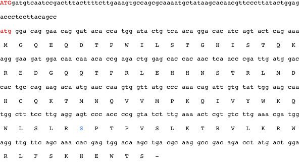 The top line, mostly in small letters, is the nucleotide sequence of the viral mRNA. During translation this sequence is read in triplets, each of which specifies an amino acid (the one-letter code for amino acids is used here). Translation usually begins with an ATG which specifies the amino acid methionine; the next triplet, gat, specifies aspartic acid, and so on. Only the first 60 amino acids of the PB1 protein are shown; the protein contains a total of 758 amino acids.
