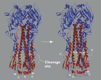 In the diagram, the globular head of the HA protein, which attaches to cell receptors, is at the top, and the viral membrane is at the bottom. For clarity, only one HA cleavage site is labeled. The uncleaved form of the protein is called HA0; after cleavage by a cellular enzyme, two proteins are produced, called HA1 (blue) and HA2 (red). The two subunits remain together at the surface of the virus particle. The new amino(N)-terminal end of HA2 that is produced by cleavage contains a sequence of hydrophobic amino acids called a fusion peptide. During entry of influenza virus into cells, the fusion peptide inserts into the endosomal membrane and causes fusion of the viral and cell membranes. Consequently, the influenza viral RNAs can enter the cytoplasm. The fusion process is described in a previous post.