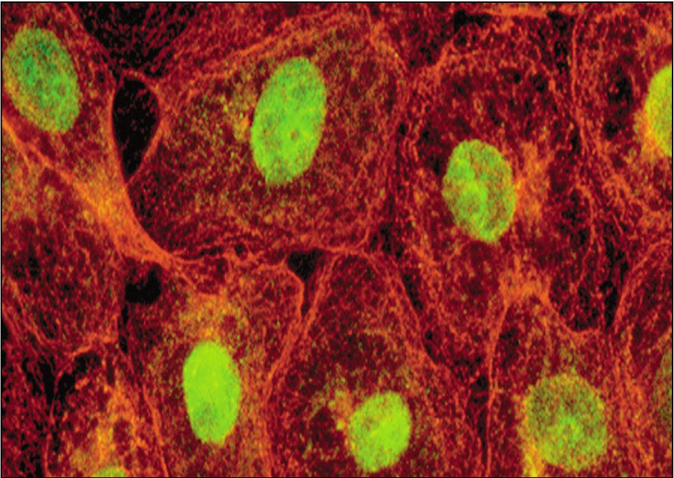 To carry out immunostaining, virus-infected cells are fixed to preserve cell morphology or tissue architecture. This step is usually accomplished with acetone, methanol, or paraformadehyde. After incubation of fixed cells with the appropriate antibody, excess antibody is removed by washing, followed by microscopy. Common indicators that are coupled to antibody molecules include fluorescein and rhodamine, which fluoresce on exposure of the cells to ultraviolet light. Filters are placed between the specimen and the eyepiece to remove blue and ultraviolet light; this ensures that the field is dark, except for cells that have bound antibody. These emit green (fluorescein) or red (rhodamine) light.