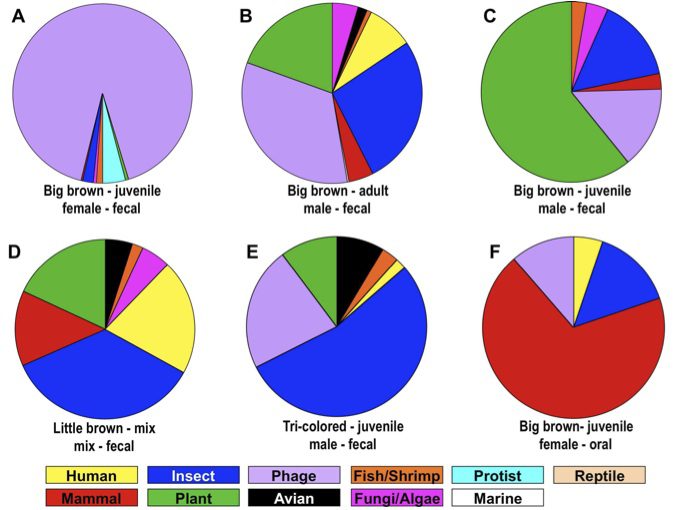 The 576,624 sequence ‘reads€™ (a read is the result of a single sequence reaction, in this study ~250 nucleotides) on six pools of fecal samples revealed an amazing diversity of viral sequences (figure), with representatives of human, other mammals, insect, bacteriophage, fish, shrimp, protist, reptile, plant, avian, fungi, algae, and marine viruses. Among the interesting findings are sequences of three novel coronaviruses from big brown bats. Many coronaviruses have previously been found in bats; the results of this study provide more evidence that these mammals are likely to be sources of future human infections.
