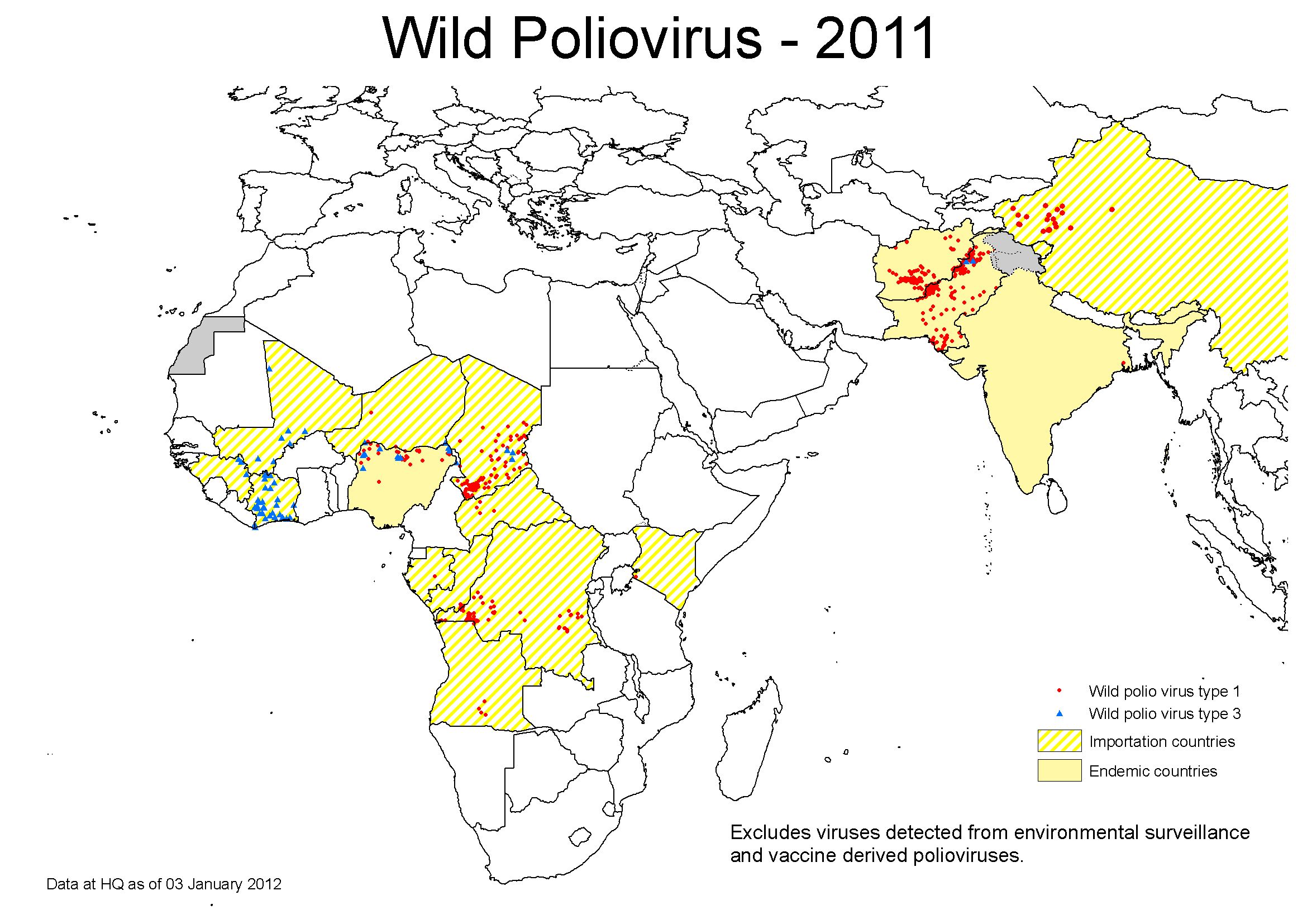 The challenge now is to keep India free of polio. The map shows why this will be difficult – there are many red dots (cases of type 1 polio) in neighboring Pakistan and Afghanistan. Poliovirus does not respect national borders – China had been free of polio since 1999, but now there are red dots in that country. That outbreak was imported from Pakistan. Even the polio cases in more distant countries such as Africa constitute a threat. As long as there is polio somewhere, all countries must maintain extensive immunization programs. Whether or not that will happen depends upon money, determination, and allowing immunization campaigns to proceed without interruption.