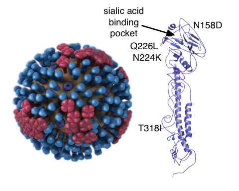 The paper from Kawaoka’s group focuses on the viral hemagglutinin (HA) protein, an important determinant of whether influenza viruses can infect birds or mammals. In the image, the HA is shown as blue ‘spikes’ on the virion surface; a single HA molecule is shown at right. Avian influenza viruses prefer to attach to cells via a specific form of sialic acid that differs from the form bound by mammalian influenza viruses. This difference in receptor preference is one reason why avian influenza viruses do not transmit among mammals.