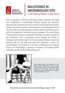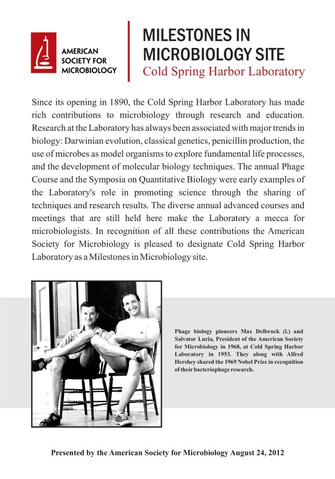 Cold Spring Harbor Laboratory is the sixth Milestones in Microbiology site. Others are the Waksman Laboratory at Rutgers University; Hopkins Marine Station in Monterey, California; the site of the University of Pennsylvania Laboratory of Hygiene; Scripps Institution of Oceanography; and the Tulane University School of Public Health and Tropical Medicine.