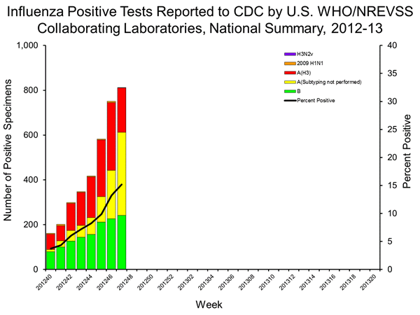 During week 47, 812 of 5,342 (15.2%) of respiratory samples tested positive for influenza virus. Of those isolates that were subtyped, most were either H3N2 or an influenza B virus strain. The 2009 swine-origin H1N1 strain has only been found in one sample so far. Fortunately the H3N2 component of the influenza vaccine for 2012-13 is a good match for the circulating H3N2 strain.