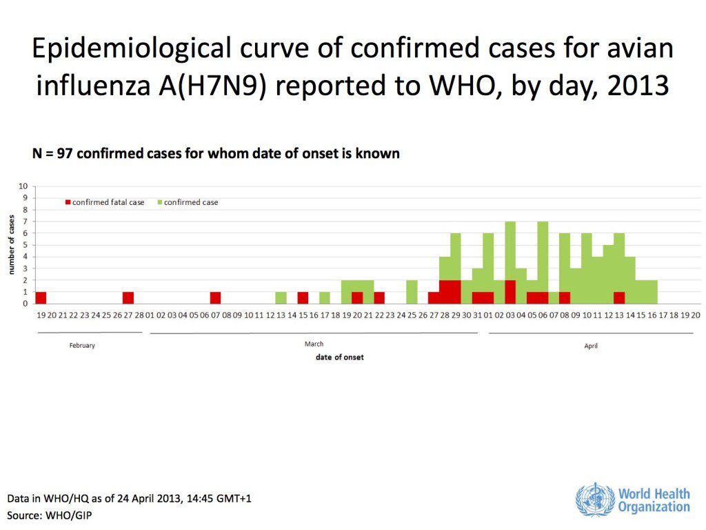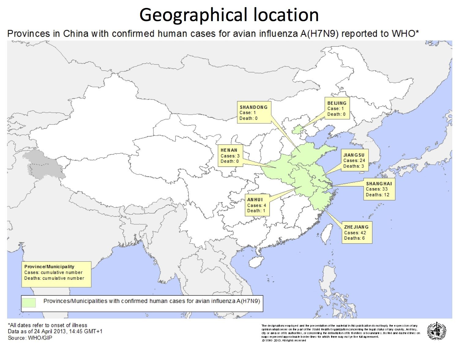 The World Health Organization has been publishing weekly reports on the avian influenza A(H7N9) outbreak which include the geographical location of each case, the cumulative number of cases, and the epidemiological curve. Go to this page at the WHO website for an archive of the weekly reports (there you will also find other useful information on the H7N9 outbreak). Images for report #3 of 24 April 2013 are reproduced below. Click each image for a larger view.