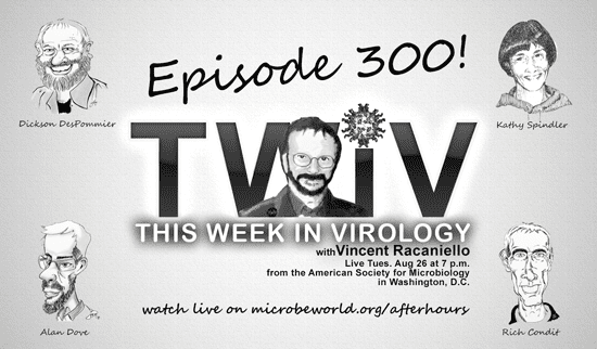 This Week in Virology, the podcast about viruses – the kind that may or may not make you sick, celebrates its 300th episode on Tuesday, August 26, 2014 with a live recording at the Washington, DC headquarters of the American Society for Microbiology. This special episode will be part of the ‘Microbes after Hours‘ series, and will feature the TWiV hosts Vincent Racaniello, Dickson Despommier, Alan Dove, Rich Condit, and Kathy Spindler recording together in person for the first time.
