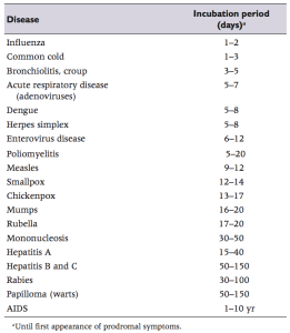 Remarkably, viral incubation periods can vary from 1 or 2 days to years (Table; click to magnify). Short incubation times usually indicate that actions at the primary site of infection produce the characteristic symptoms of the disease. Longer incubation times indicate that the host response, or the tissue damage required to reveal the symptoms of infection, take place away from the primary site of infection.