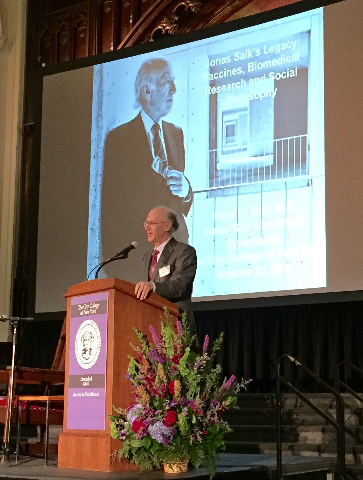 Jonas Salk, who lead the team that developed the first poliovirus vaccine, was born 100 years ago today, 28 October 1914, in New York City. Numerous sites across the country have convened symposia in his honor. Last week City College of New York, where Salk earned a bachelor’s degree, held a centennial celebration. The photo shows Salk’s son Peter speaking at the celebration. New York University Medical Center, where Salk obtained his MD degree, also had a celebration last week. The Salk Institute, founded by Jonas Salk, will hold a celebration on 13 November. And today’s Google Doodle is in honor of Dr. Salk.