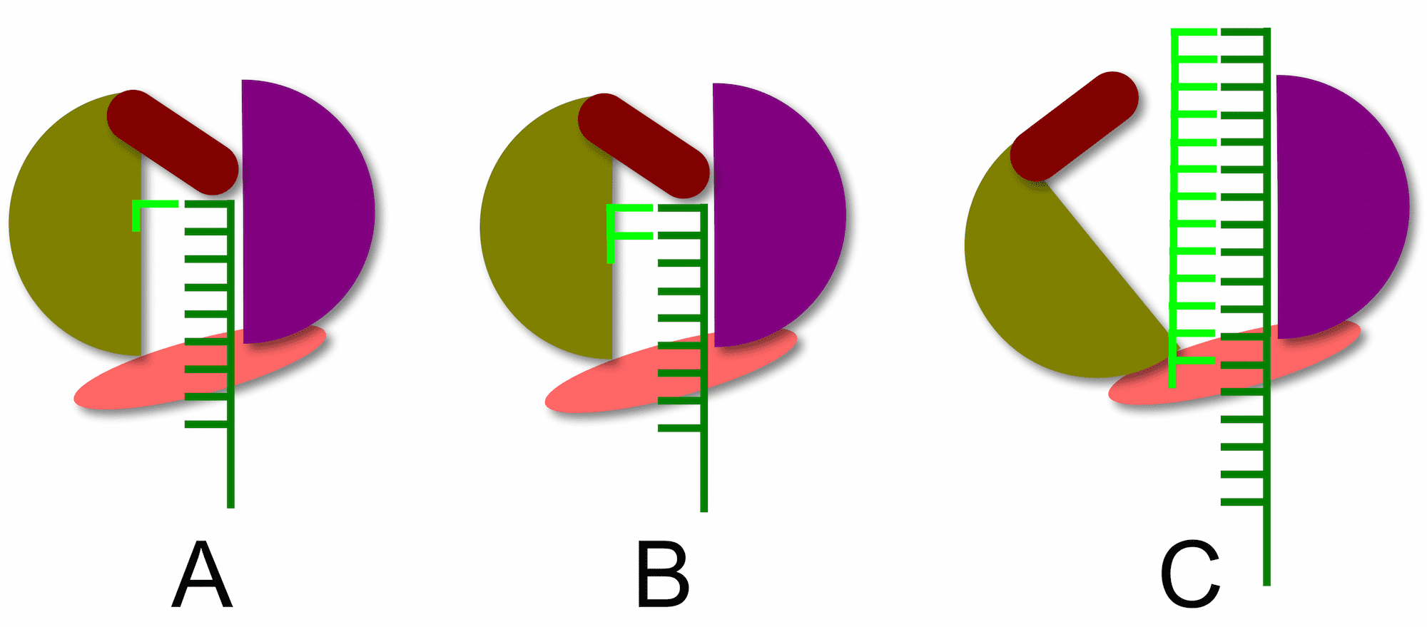The structure of the RNA-dependent RNA polymerase of hepatitis C virus reveals how a primer-independent RNA polymerase positions the first nucleotide on the RNA template. This process is illustrated below. With the RNA template (dark green) in the active site of the enzyme (panel A), a short beta-loop (brown) provides a platform on which the first complementary nucleotide (light green) is added to the template. The second nucleotide is then added (panel B), producing a dinucleotide primer for RNA synthesis. At this point nothing further can happen because the priming platform blocks the exit of the RNA product from the enzyme (panel B). The solution to this problem is that the polymerase undergoes a conformational change that moves the priming platform out of the way and allows the newly synthesized complementary RNA (panel C, light green) to exit as the enzyme moves along the template strand.