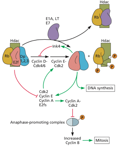 When adenovirus infects a cell, the first event is synthesis of mRNA that encodes the E1 proteins. These proteins are needed to start cellular DNA synthesis. Most cells in our bodies are not dividing, an environment not conducive to viral replication. The adenovirus E1 proteins solve this problem. The E1A protein binds the cellular Rb (retinoblastoma) protein, which is normally bound to members of the E2f family of transcription factors (illustrated, upper left). Binding of E1A to Rb frees E2f which goes on to induce the transcription of cell genes needed for DNA synthesis and cell division.