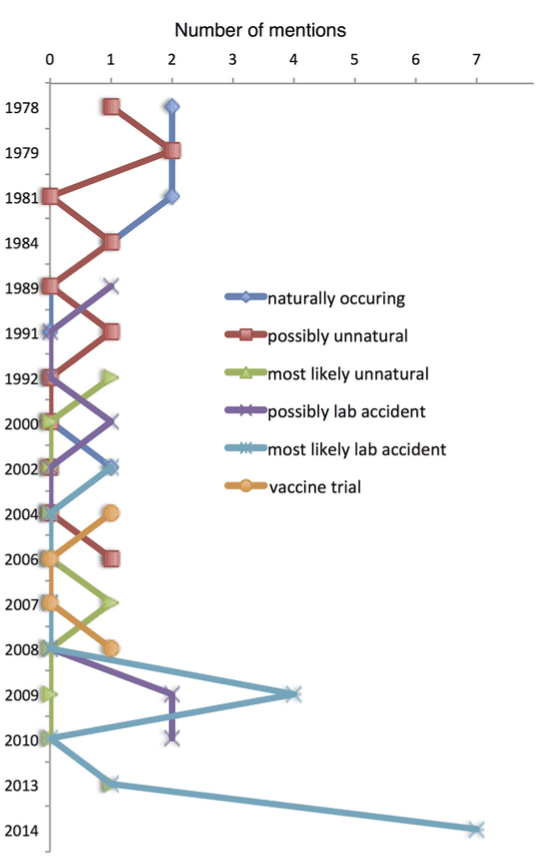 It is of interest that with the onset of the gain-of-function debate, which began in 2011 with the adaptation of influenza H5N1 virus to aerosol transmission among ferrets, the ‘laboratory accident’ scenario for the emergence of the 1977 strain has been increasingly used as an example of why certain types of experiments are ‘too dangerous’ to be done (See graph, upper left). For example, Wain-Hobson says that ‘1977 H1N1 represented an accidental reintroduction of an old vaccine strain pre-1957, probably from a Russian research lab’. Furmanski writes that ‘The virus may have escaped from a lab attempting to prepare an attenuated H1N1 vaccine’. In the debate on gain-of-function experiments, the laboratory escape hypothesis is prominently featured in public presentations.