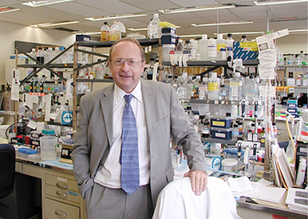 Within minutes we were in Peter’s car, driving far downtown to a small garage filled with shelf parts. The proprietor loaded some into Peter’s car and we returned to Mt. Sinai, where we carried the metal pieces up the elevator into the laboratory. There I bolted them together and made one set of shelving for the low lab bench, and a second set for a higher bench. The photo of Peter shows what the shelves looked like just a few years ago.