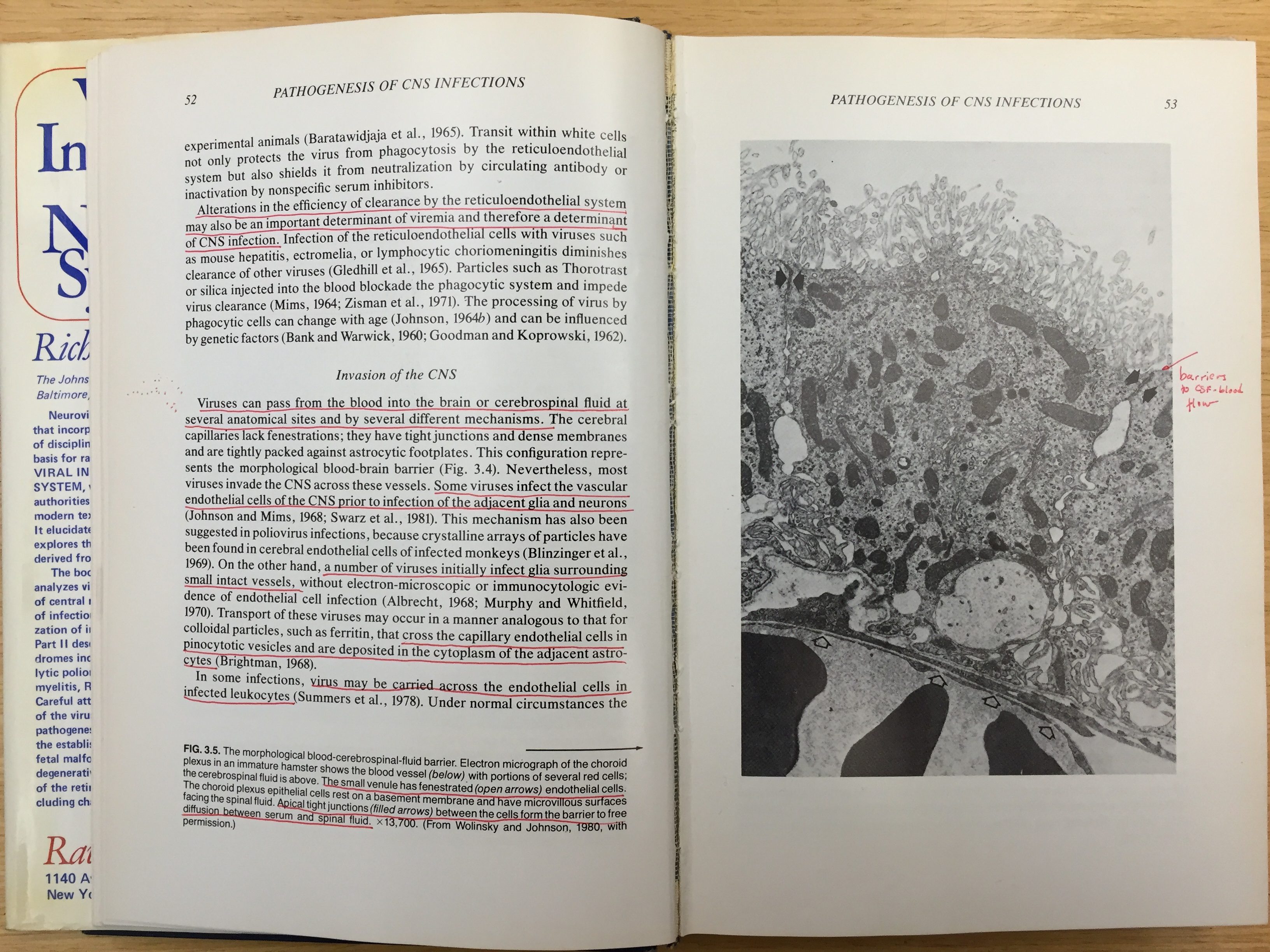 For me the most valuable chapter was ‘Pathogenesis of CNS Infections’ in which Johnson discussed how viruses move into and within that system. Many of the pages in that chapter are underlined and marked with comments (see photo below).