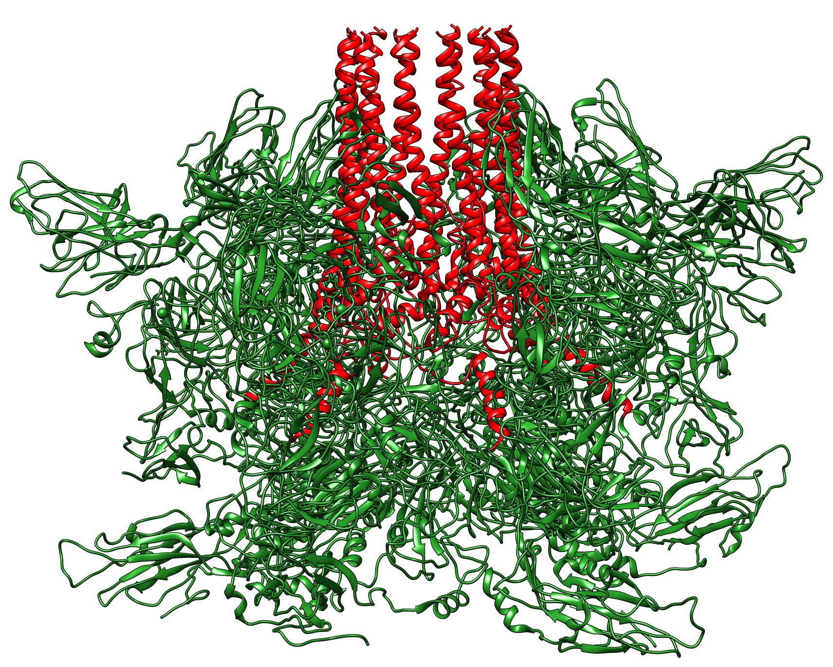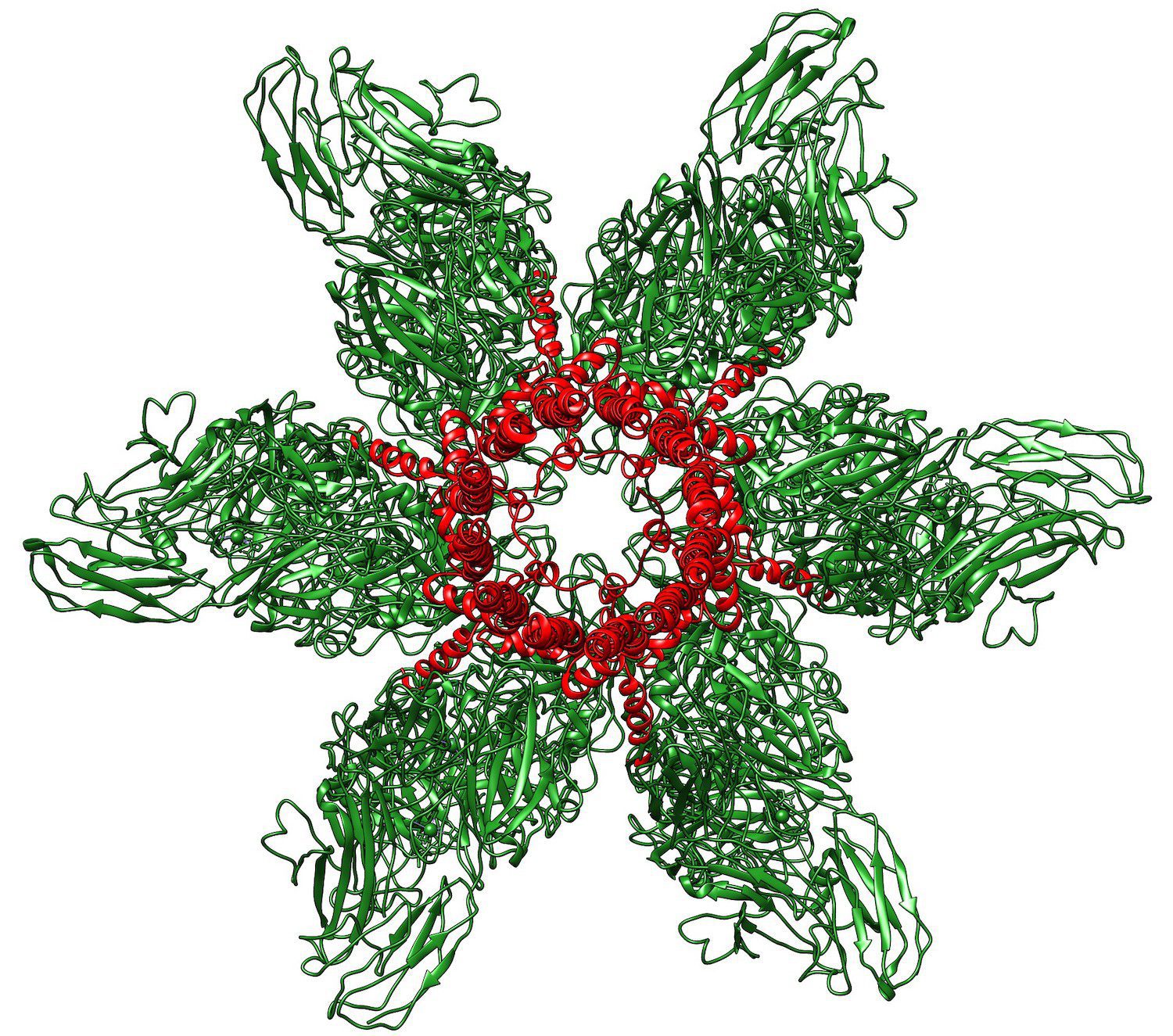 Below is a side view of the portal; the 12 extended VP2 molecules (red) are clearly visible.