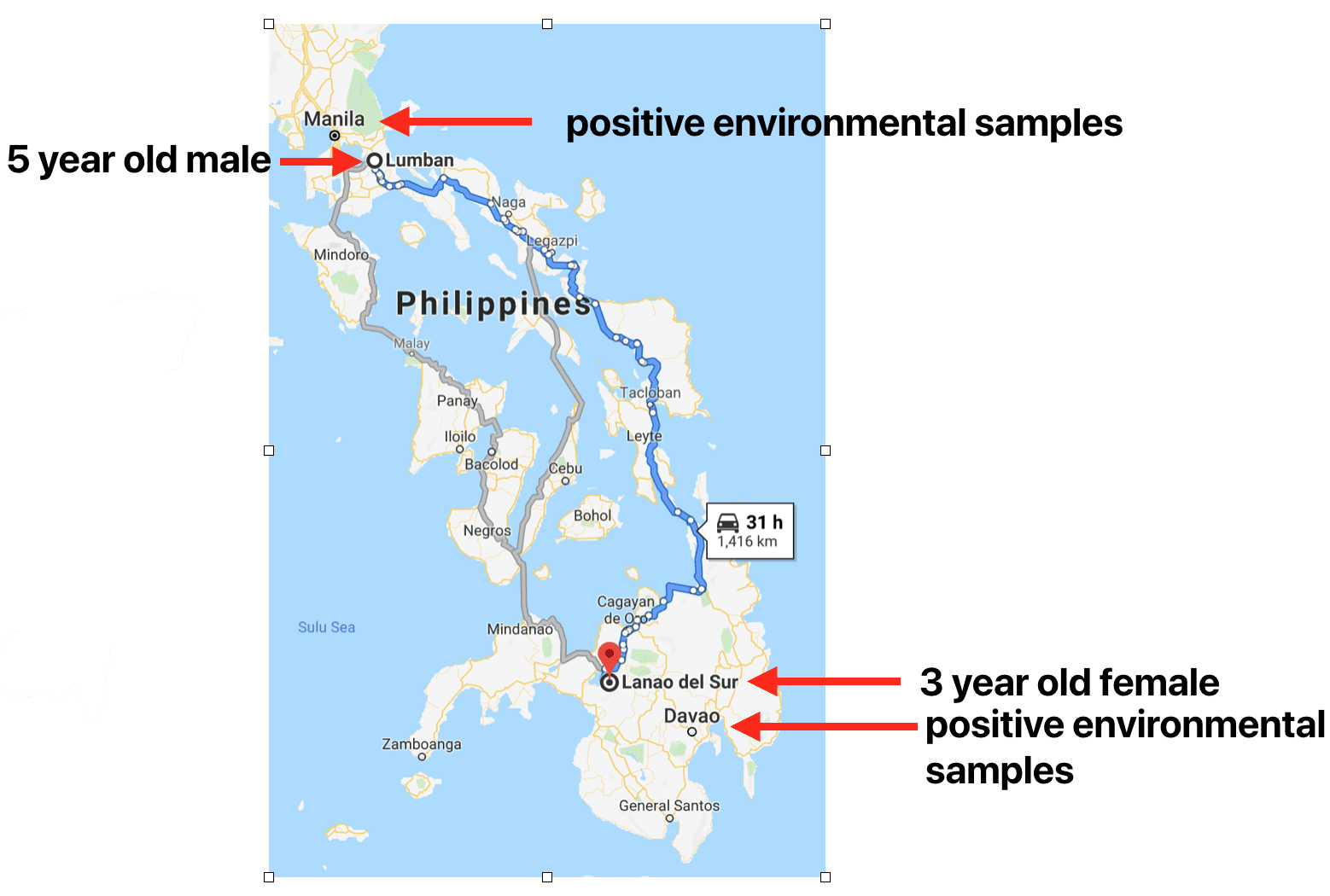 The two cases of poliomyelitis were in a 5 year old male in the north and a 3 year old female in the south (illustrated). Poliovirus-positive environmental samples were also found near both locations. These observations indicate that polioviruses are likely circulating throughout the country.