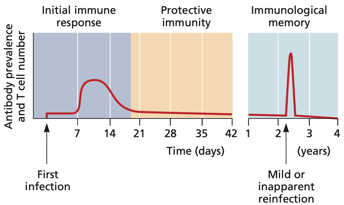Immune memory is maintained by dedicated T and B lymphocytes that remain after an infection has been resolved, and most activated immune cells have died. These memory cells can respond rapidly to a subsequent infection (Figure). Ideally, an effective and durable vaccine is one that induces and maintains significant numbers of memory cells. If the host is infected again with this same pathogen, the memory B and T cells initiate a response that rapidly controls the pathogen before disease develops. This paradigm is true for most human viruses for which vaccines exist, including measles, mumps, and varicella-zoster viruses and poliovirus. In some cases, antigenic variation, such as occurs with influenza virus, precludes complete protection by a memory immune response, necessitating re-vaccination.