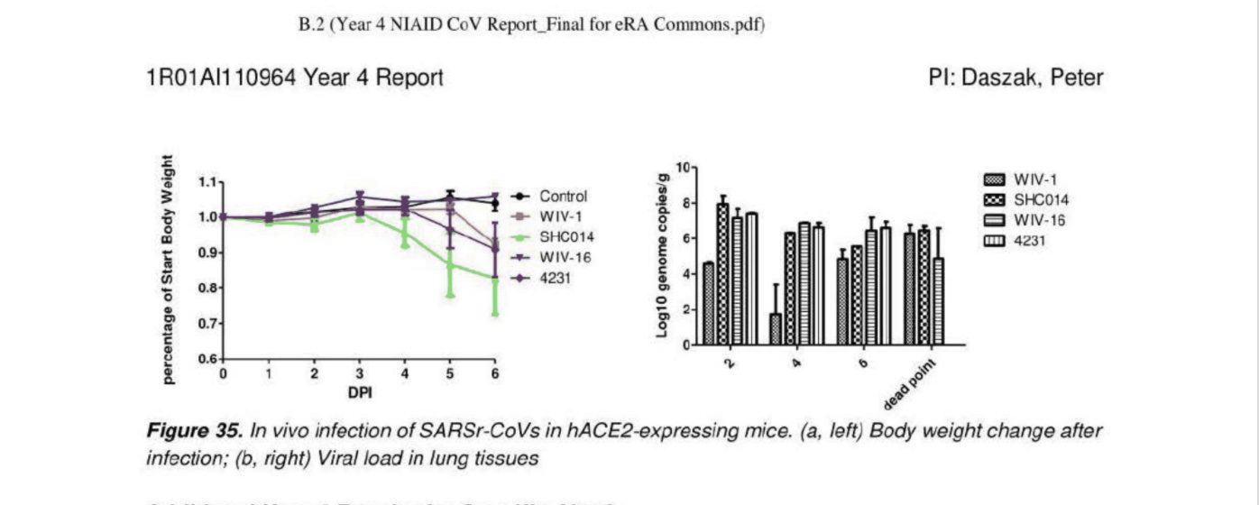 One of the figures from the released grant materials shows the results of two experiments using recombinant SARS-like coronaviruses that were constructed in the laboratory. As I described previously, after the SARS-CoV pandemic of 2003, wildlife sampling efforts in China revealed many SARS-like coronaviruses in bats. To assess the potential of these viruses for infecting humans, their spike protein encoding genes were substituted into the SARS-like CoV WIV1.