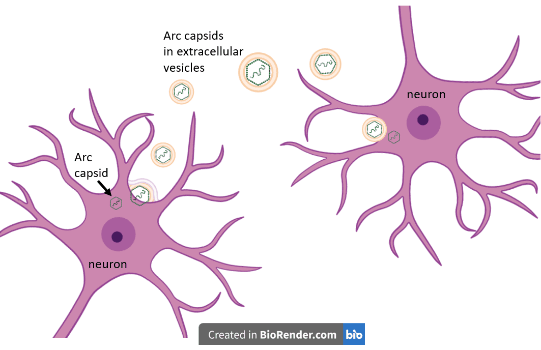 Additional experiments by the Shepherd group showed that not only does Arc protein spontaneously assemble into capsids inside neuronal cells, but the capsids also bind and encapsulate Arc mRNA, are released in extracellular vesicles that form when the cell membrane extends into an outward bubble and pinches off from the cell, and traffic that RNA to the next neuronal cell in a putative mechanism of intercellular communication. The authors observed a higher number of completely formed capsids when there was also RNA present, regardless of whether the RNA encoded Arc protein. This suggested that the presence of RNA enhances the likelihood of capsid assembly, in agreement with what is observed with HIV Gag. They also showed that the ability of target neuronal cells to take in Arc capsids is likely mediated by endocytosis, a mechanism in which cells absorb and engulf external material. Following entry of capsids into neurons, there was an increase in Arc protein levels in the branched extensions of neurons (i.e., the “dendrites”), which did not occur in the presence of a drug that inhibits protein synthesis, thus suggesting that the Arc mRNA contained in the capsids was actually translated inside these dendrites. Work done by a different group showed that each of these functions was also manifested by the corresponding Drosophila gene, even though this gene is thought to have evolved independently of the mammalian Arc gene.